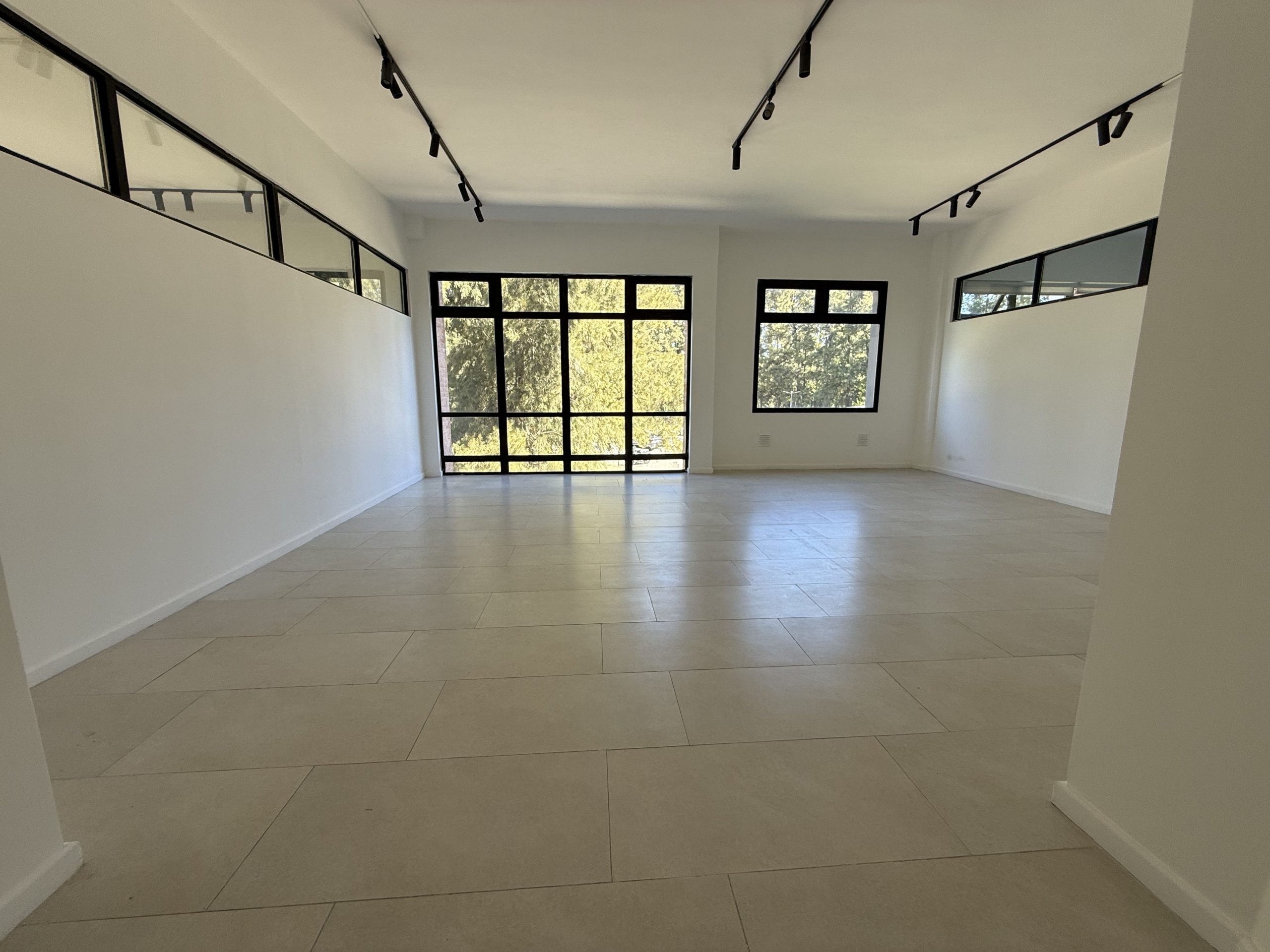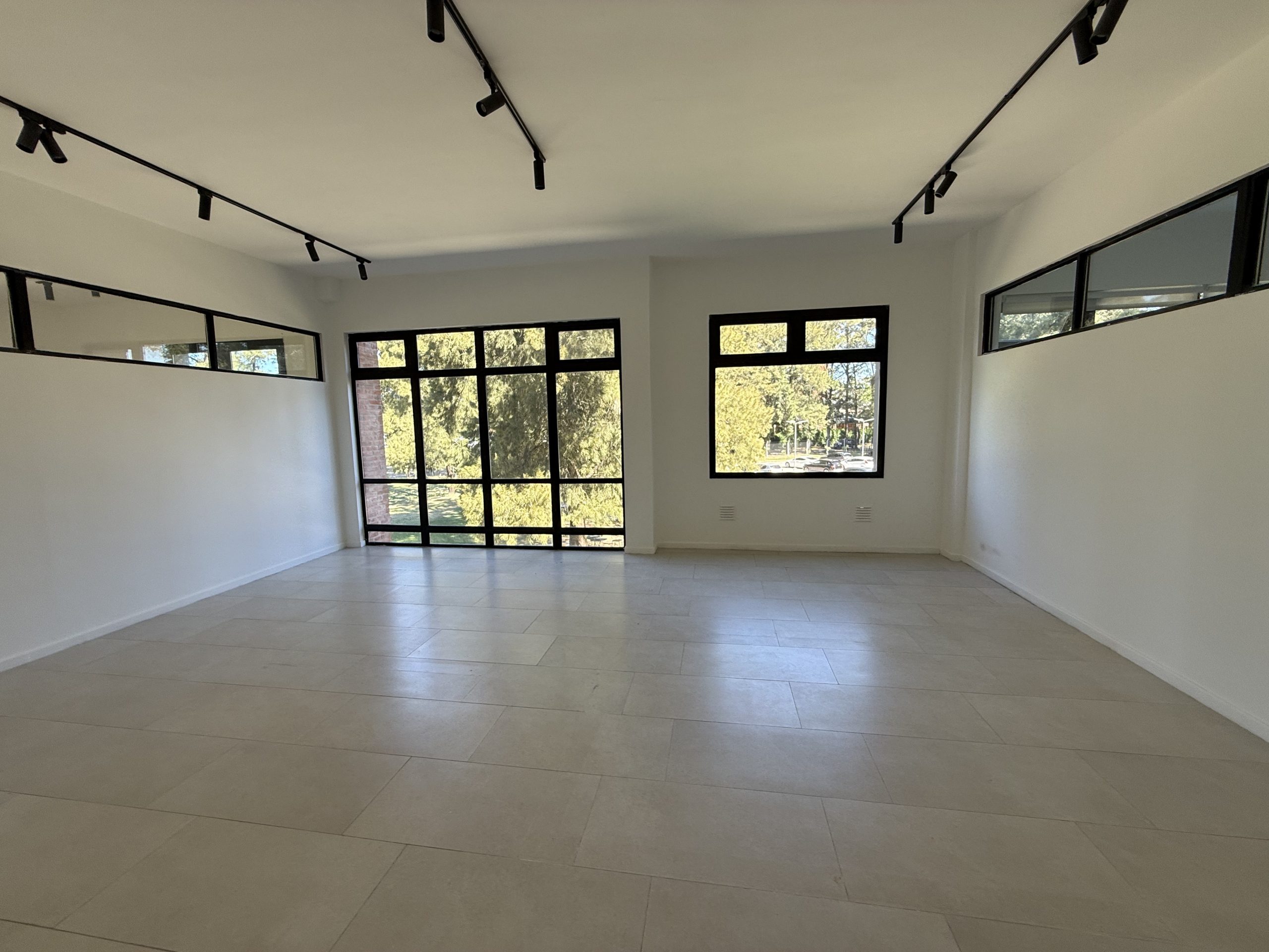 Oficina en planta libre. Ventanales de aluminio negro línea Módena, con vidrios DVH y ventiluces batientes que aseguran excelente iluminación natural, ventilación y óptimo aislamiento térmico y acústico.