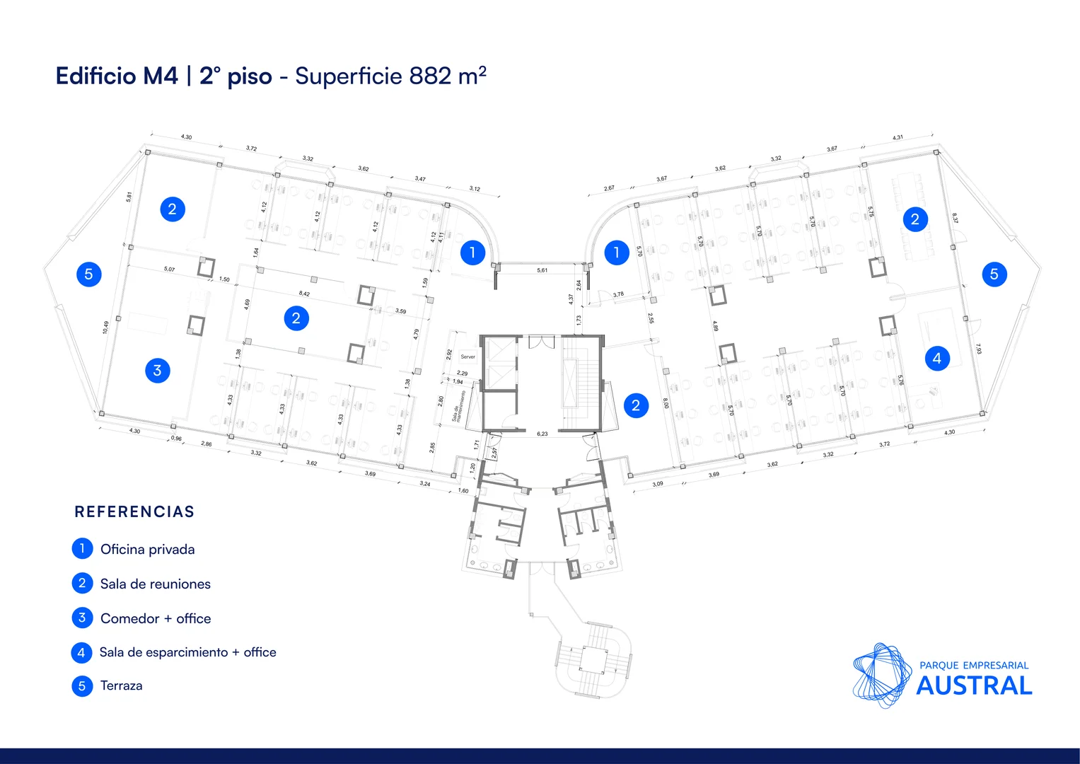 El layout incluye: open space para usos flexibles, 4 salas de reuniones con divisiones de aluminio y vidrios laminados, 2 oficinas privadas, office independiente con comedor, sala de esparcimiento con office, 2 box insonorizados, baños independientes y dos terrazas de uso exclusivo con vistas abiertas al Parque.